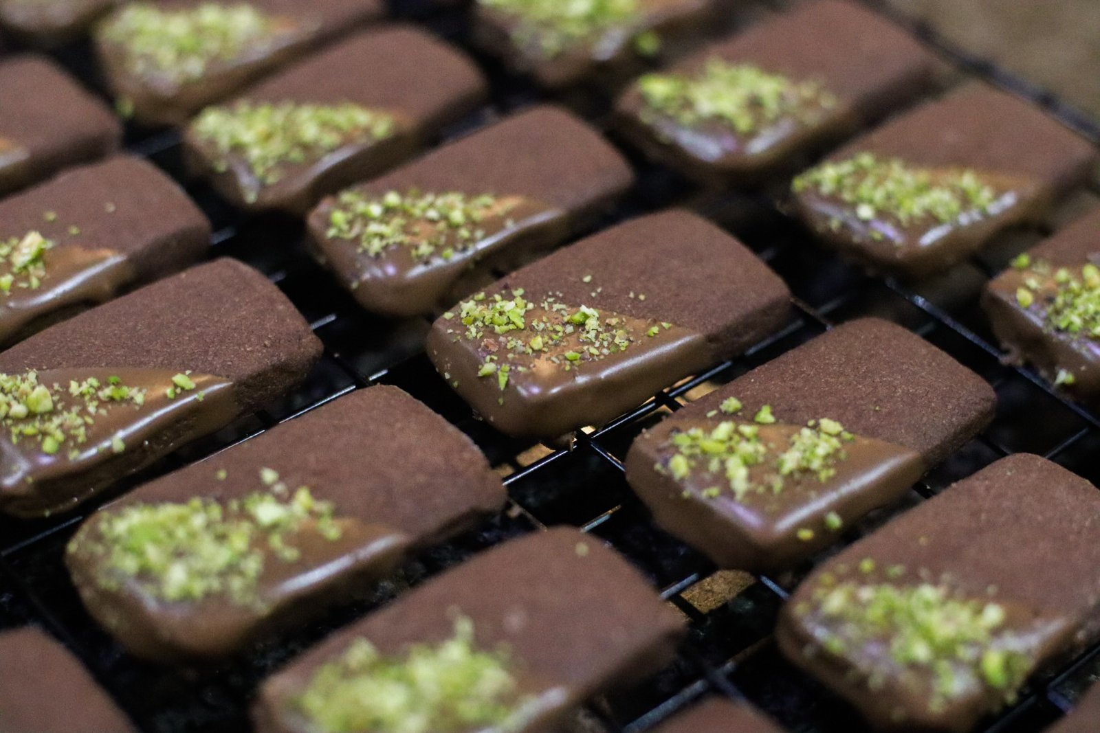- Sprinkle crushed pistachios over the chocolate before it sets.