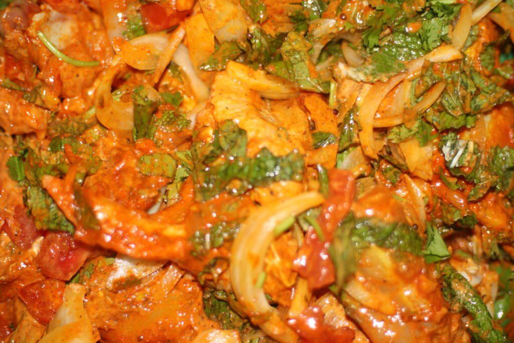 - Marinate Everything Together: In a large mixing bowl, add the chicken pieces, vadouvan, Kashmiri chilli powder, turmeric, crushed ginger, crushed garlic, green chillies, thyme, curry leaves, salt, garam masala, and yogurt. Add the sliced onions, sliced tomatoes, chopped mint, chopped dhania, and sliced potatoes. Mix thoroughly until everything is well coated. Marinate for at least 30 minutes, or longer for deeper flavor.