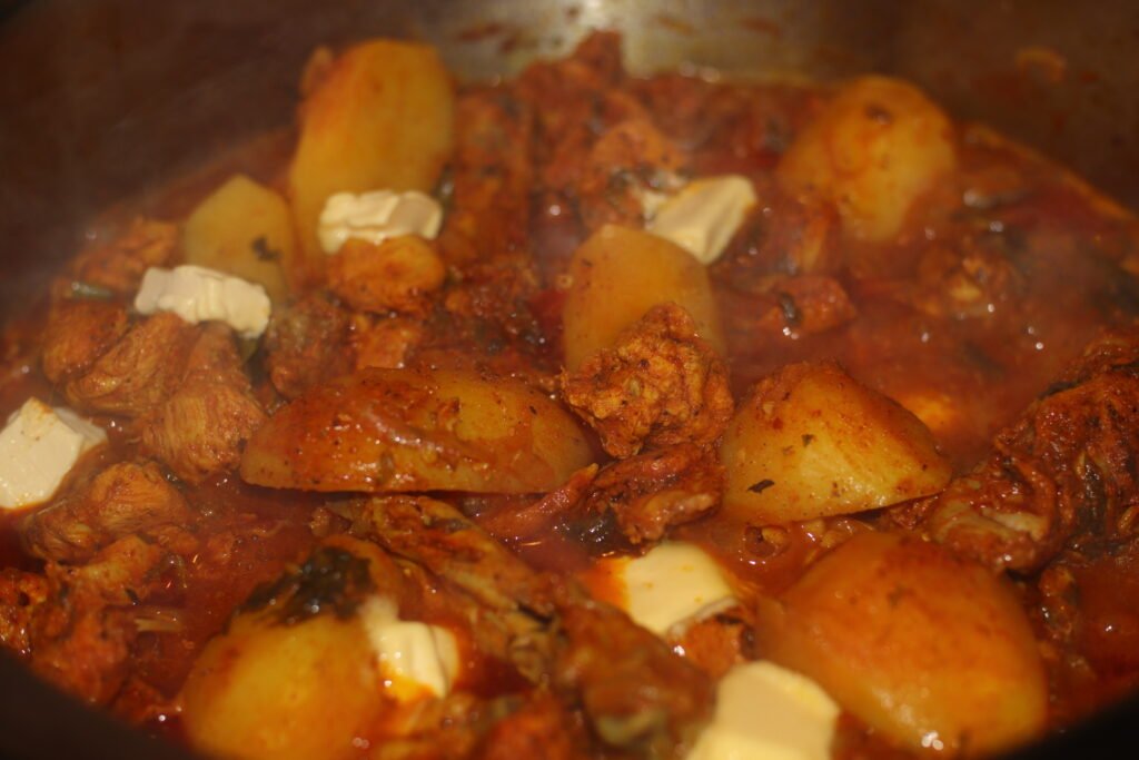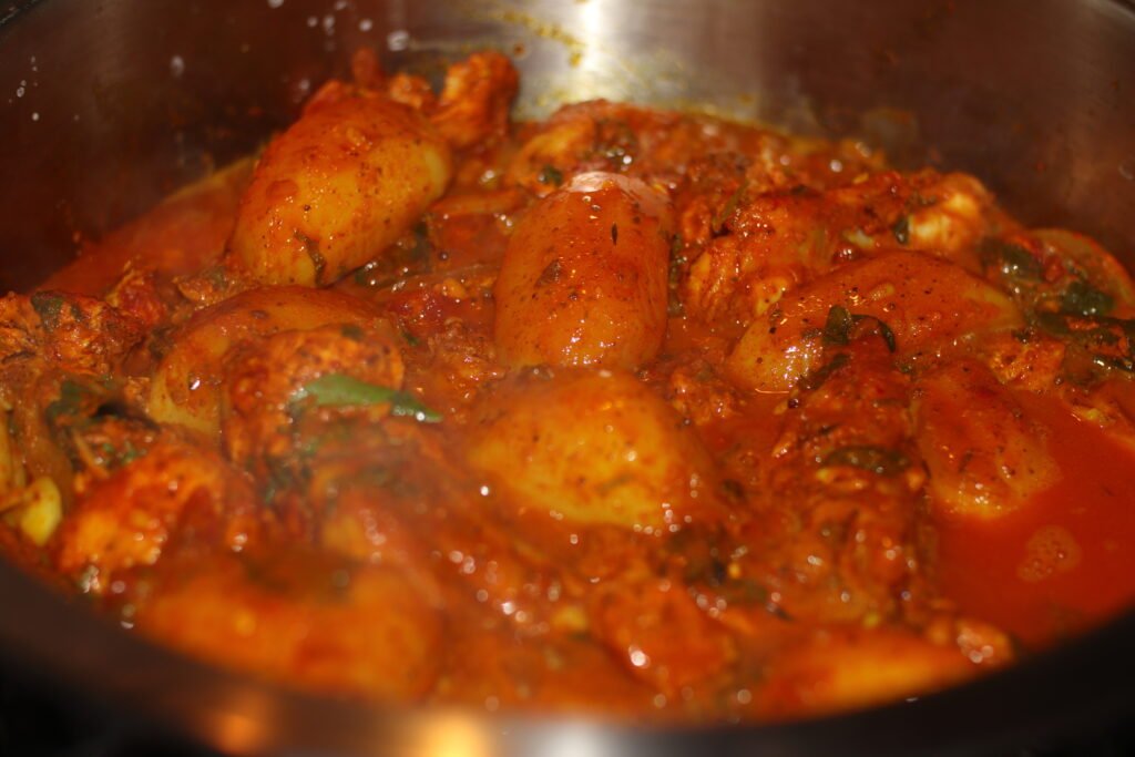 - Cook the Marinated Chicken: Heat oil in a large pot. Add the entire marinated mixture to the pot. Cook on medium heat, stirring occasionally. Add a little water (about 1 – 2 cups) to help the potatoes cook and prevent burning. Simmer until the chicken is fully cooked and the potatoes are tender.