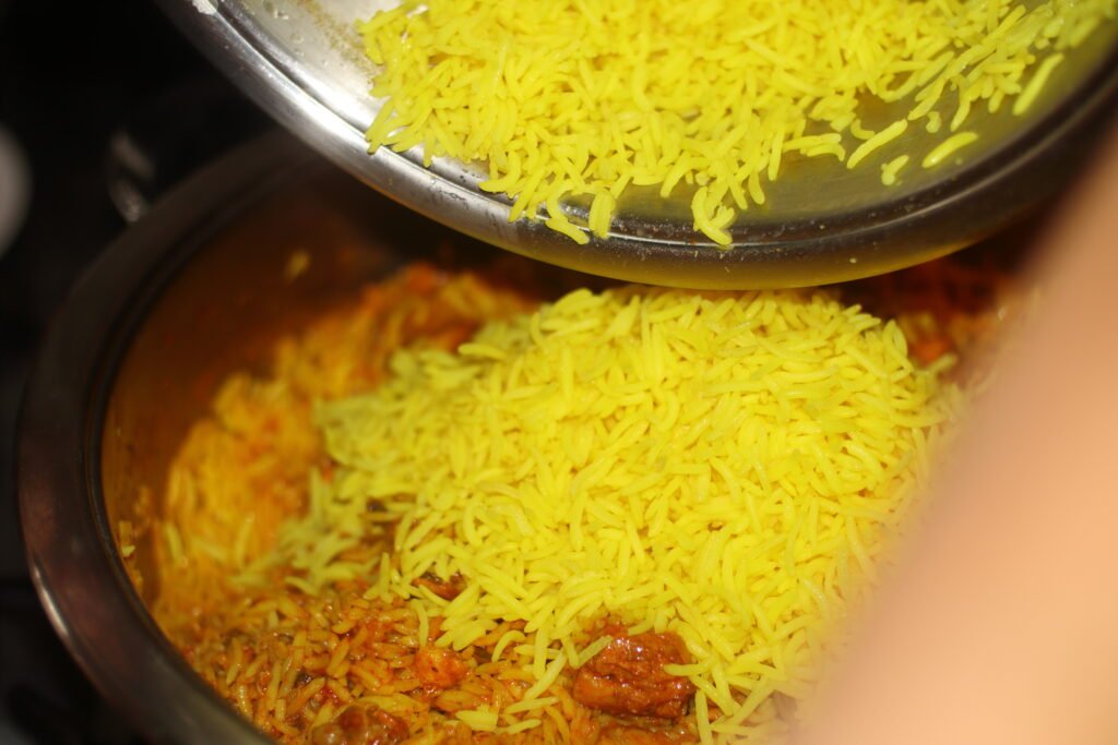 Start by rinsing the basmati rice until the water runs clear. This removes excess starch and prevents the rice from becoming sticky. Once rinsed, boil it with salt, turmeric, and a cinnamon stick. Cook until the grains are about 80% done. They should still have a slight bite because they’ll finish cooking during the steam process later.