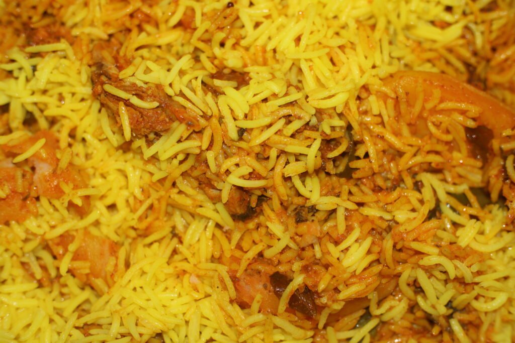 While cooking (before the potatoes are almost cooked), place small pieces of margarine over the chicken mixture. This enriches the flavor, adds creaminess, and ensures the masala coats the rice evenly later.