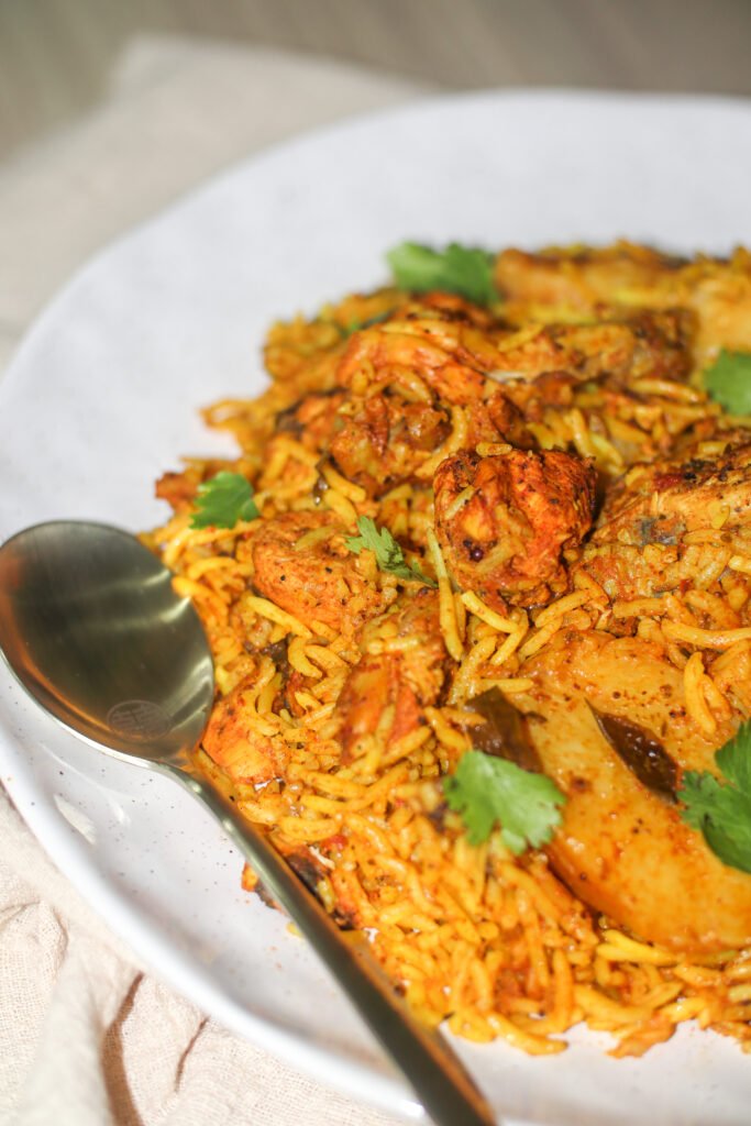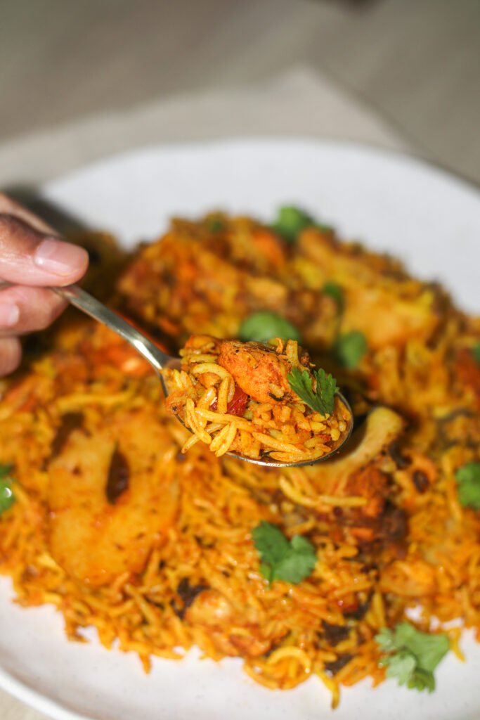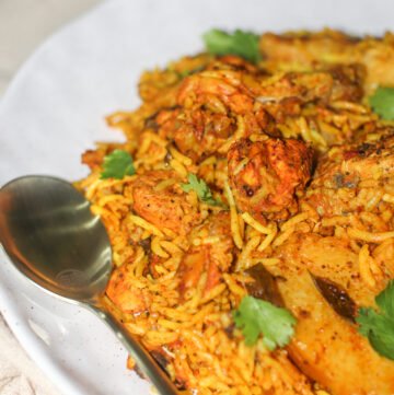 This easy chicken biryani proves that you don’t need complicated layering to achieve rich, flavorful results. By marinating everything together, cooking the chicken and potatoes first, and gently folding in parboiled rice, you get juicy chicken, tender potatoes, and fragrant, perfectly cooked rice in one pot.