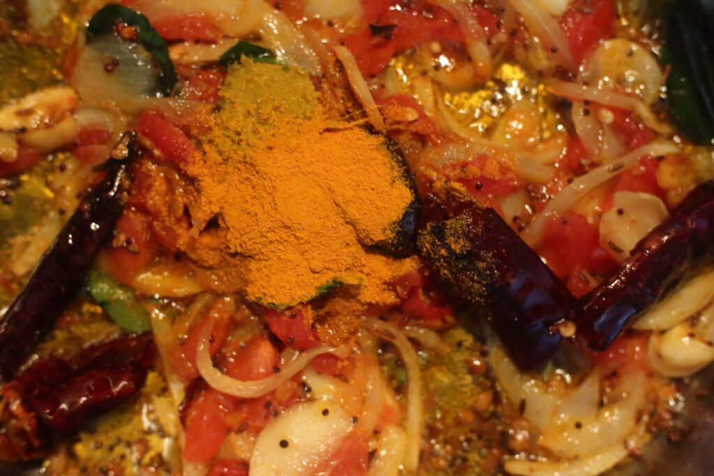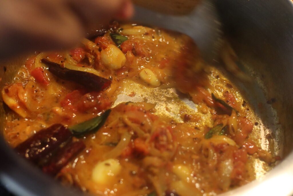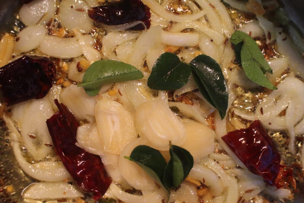 - Add the onions, dried red chillies, curry leaves, garlic cloves, and vadouvan. Cook until the onions soften and turn lightly golden.