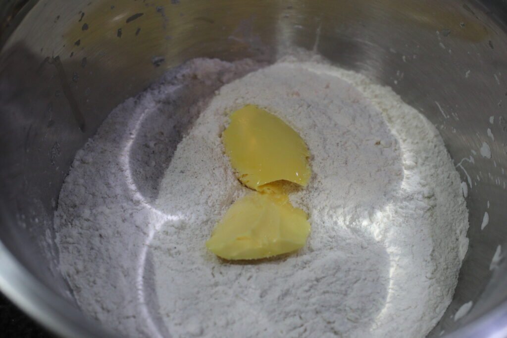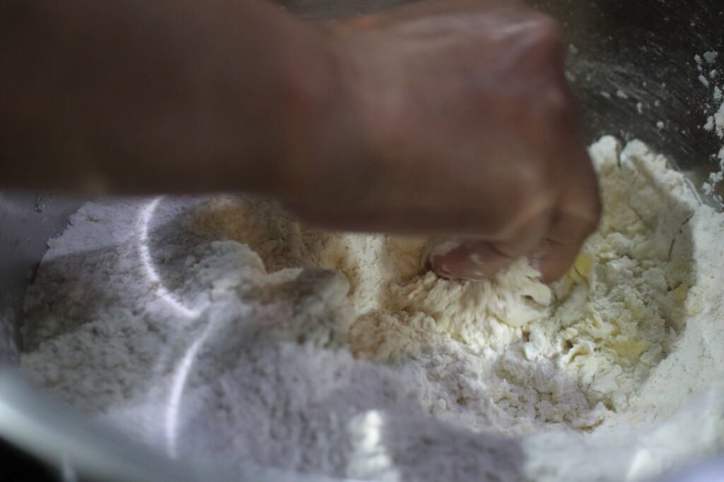 Add the softened butter to the dry ingredients and gently rub it in with your fingers until the mixture resembles fine breadcrumbs. This helps create a light, tender texture in the dough.