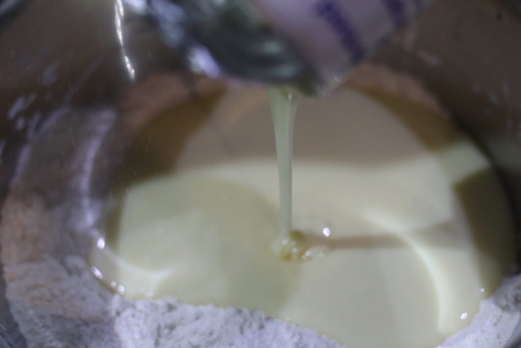 Pour the condensed milk into the breadcrumb-like mixture and gently combine until a soft, pliable dough forms. The condensed milk adds sweetness, moisture, and richness, helping the dough come together smoothly.