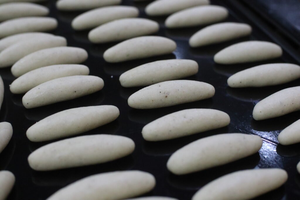 Divide the dough into small portions and gently shape each piece into smooth, elongated ovals. Ensure there are no cracks on the surface so they fry evenly and soak up the syrup beautifully. You can then place them on a non-stick baking tray to rest.