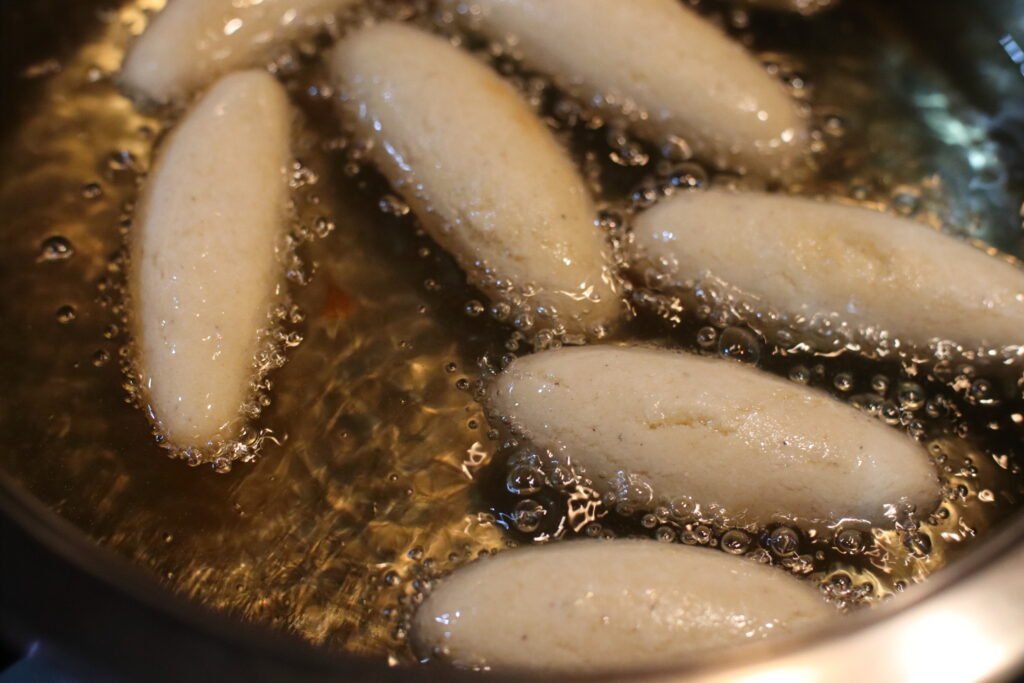 Heat oil in another pot over medium-low heat. To check if the oil is ready, drop a small piece of dough – it should slowly rise to the surface and form tiny bubbles.