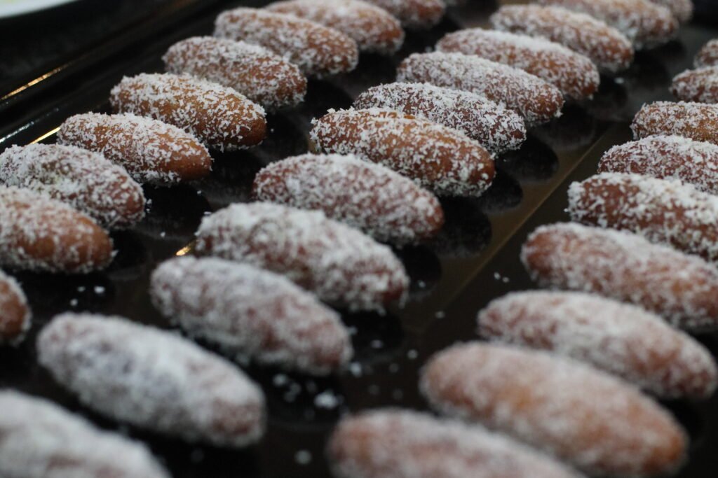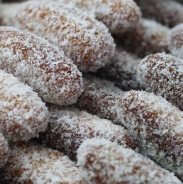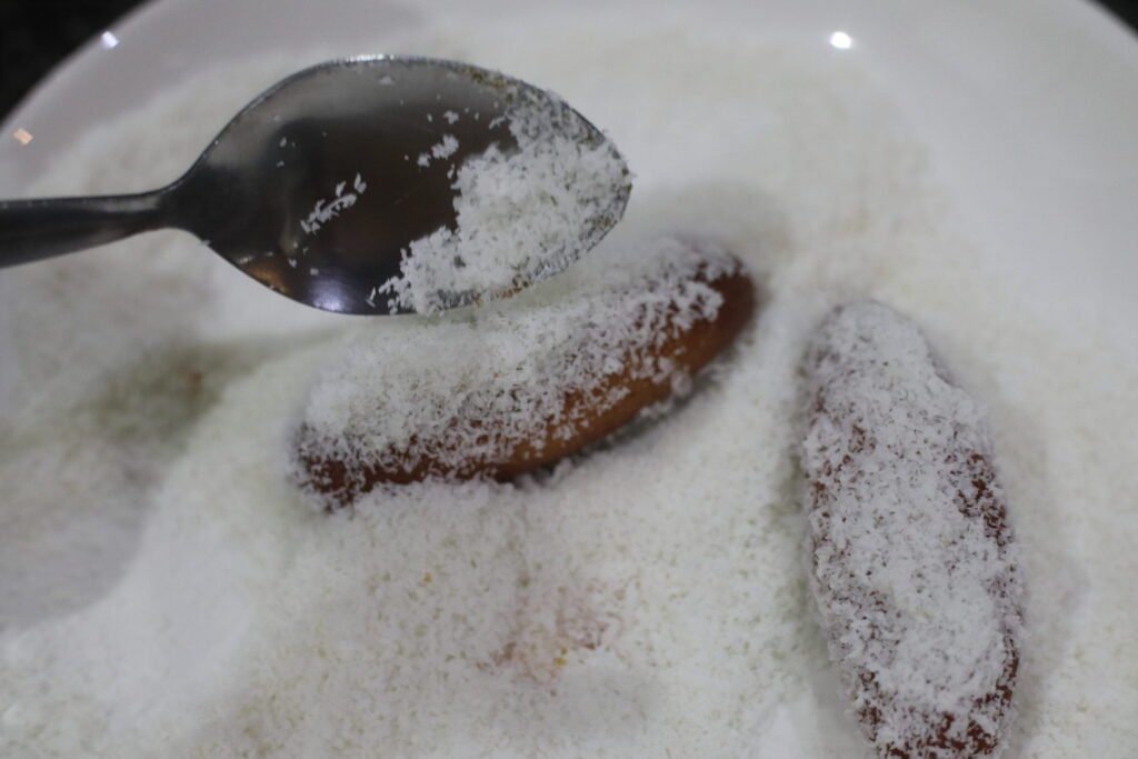 - Remove from syrup, let excess drip off, and roll in desiccated coconut.