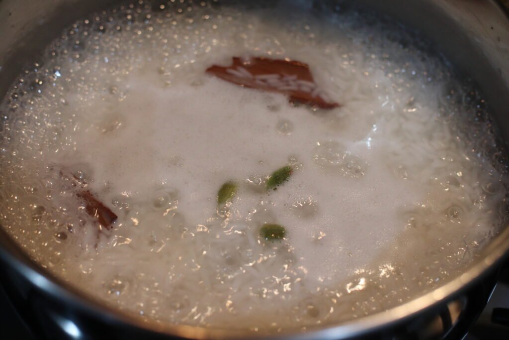 Step 2: Add the rinsed rice to about 8 cups of clean boiling water along with the cinnamon stick. If you’re using whole cardamom (elachi pods), add them at this stage; if using ground elachi, reserve it for step 7. Simmer over medium-high heat until gently boiling, allowing the cinnamon to infuse the rice.
