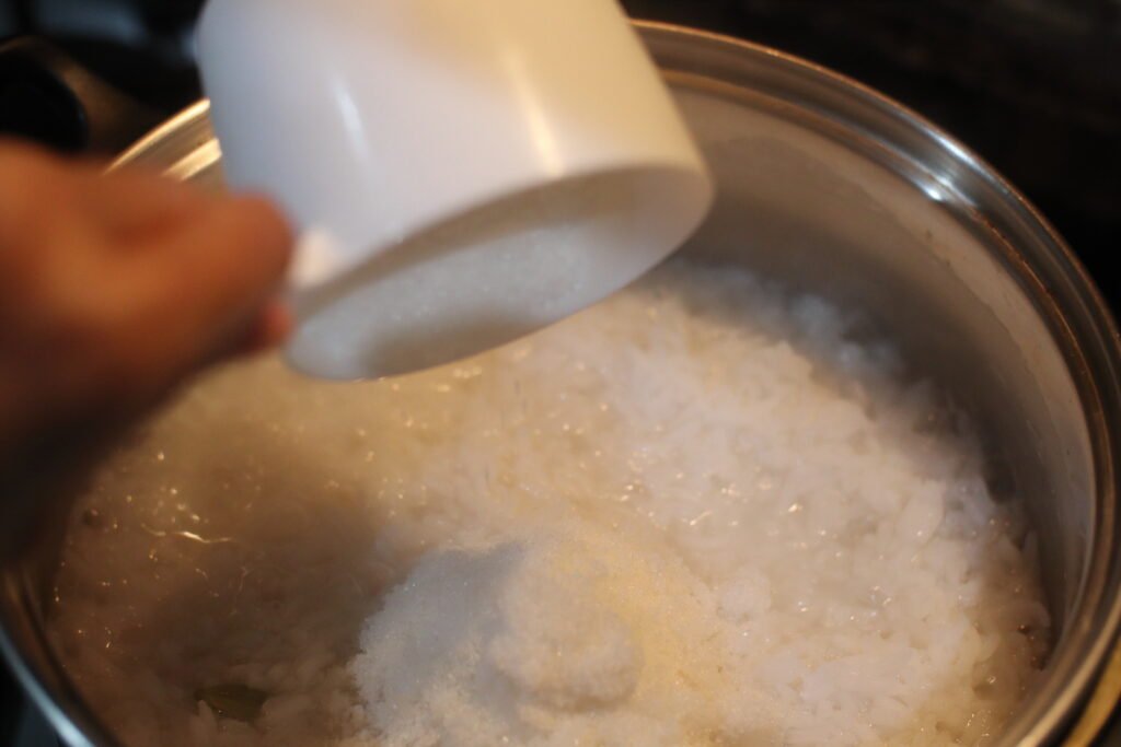 Step 3: As the rice begins to soften (cooked on the outside but still slightly firm in the centre) and the water starts to reduce, add the sugar to sweeten the rice.