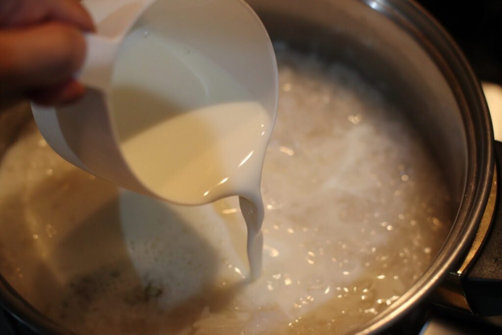 Step 5: Gradually pour in the milk, stirring gently to help the rice absorb it evenly and prevent sticking or curdling. Keep the heat low so the milk warms slowly and becomes creamy; high heat can cause it to catch at the bottom of the pot.