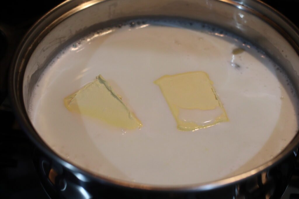 Step 6: Add margarine in blocks at a time and stir gently. The margarine will melt into the milk, creating a glossy, velvety finish and deepens the creamy texture that makes this pudding so comforting.