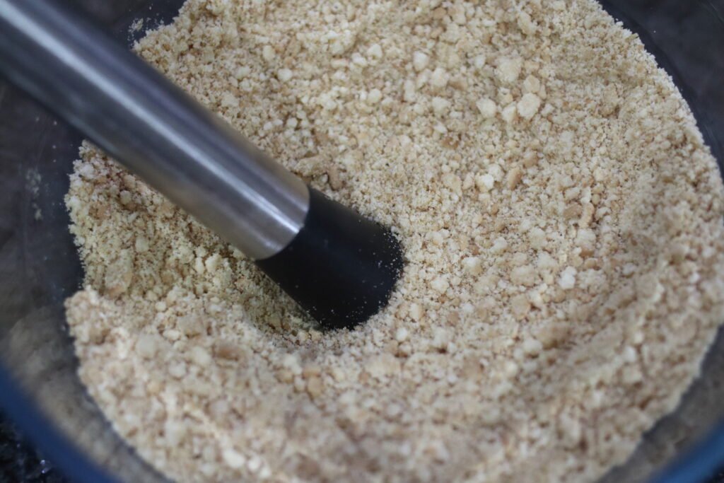 • Place the coconut biscuits in a bowl and crush them until fine. I used a 25 cm stainless steel muddler, but you can also use a rolling pin, a food processor, or the bottom of a heavy glass.