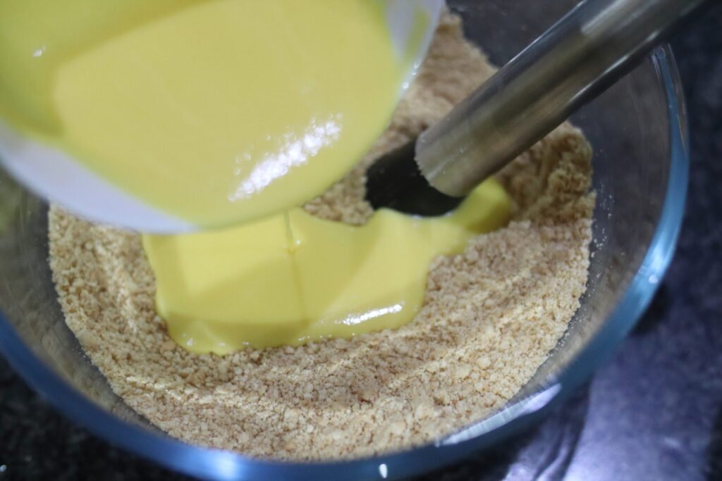 Melt the unsalted butter and add it to the crushed biscuits. Mix well until the texture resembles wet sand.