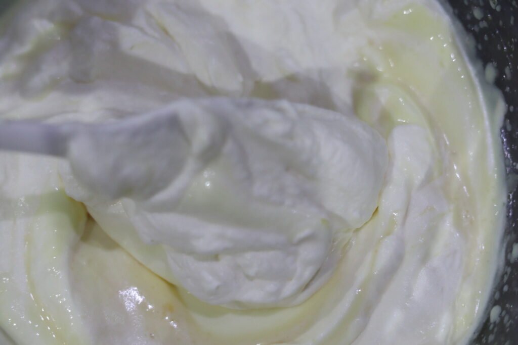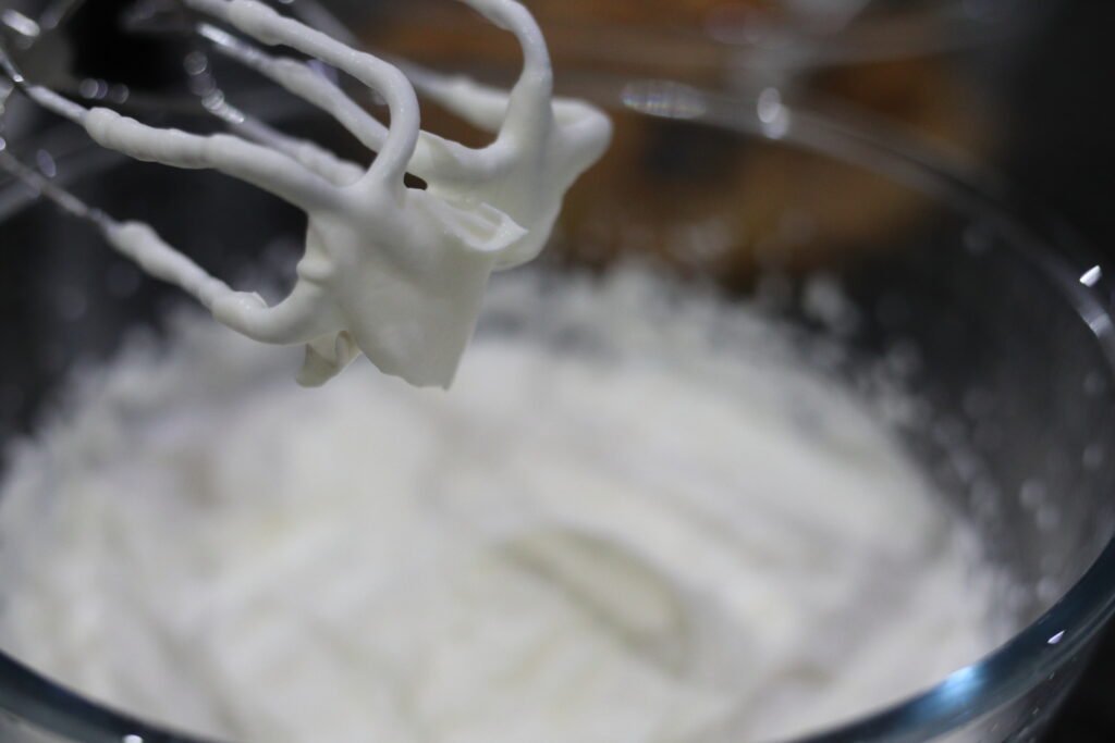 • In another bowl, whip the fresh cream until soft peaks form. Do not overwhip, as this can cause the cream to split.