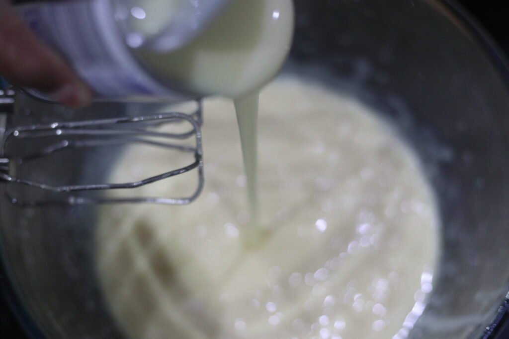 • In a separate bowl, mix the cottage cheese and condensed milk until smooth and well combined.