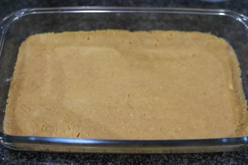 • Spoon the biscuit mixture into your baking dish. Use a spatula or the back of a spoon to press it down firmly into an even layer.