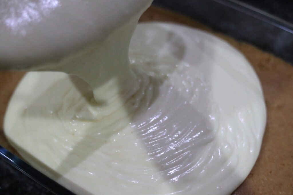 • Pour the cheesecake mixture over the prepared biscuit base. Smooth the top with a spatula.