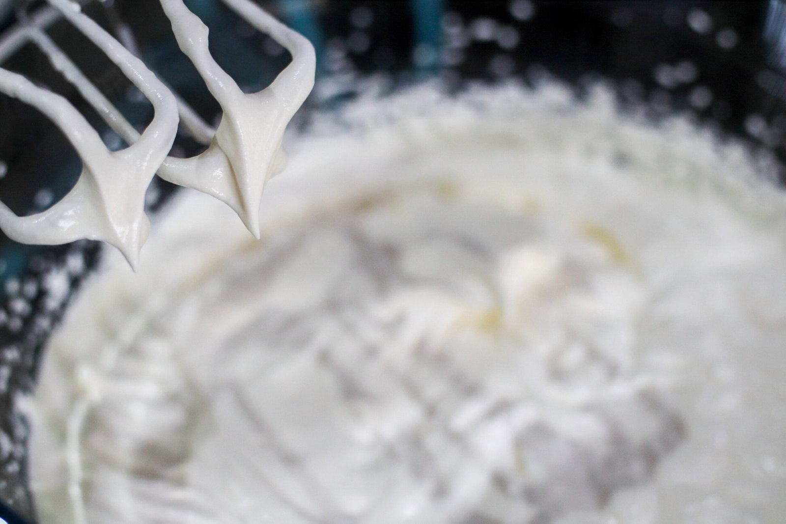 - In a large mixing bowl, whip the fresh cream until soft peaks form. Do not overwhip otherwise the cream will split.