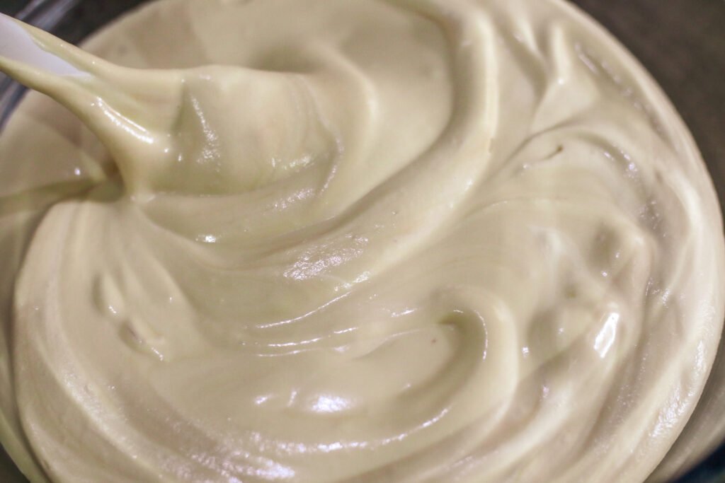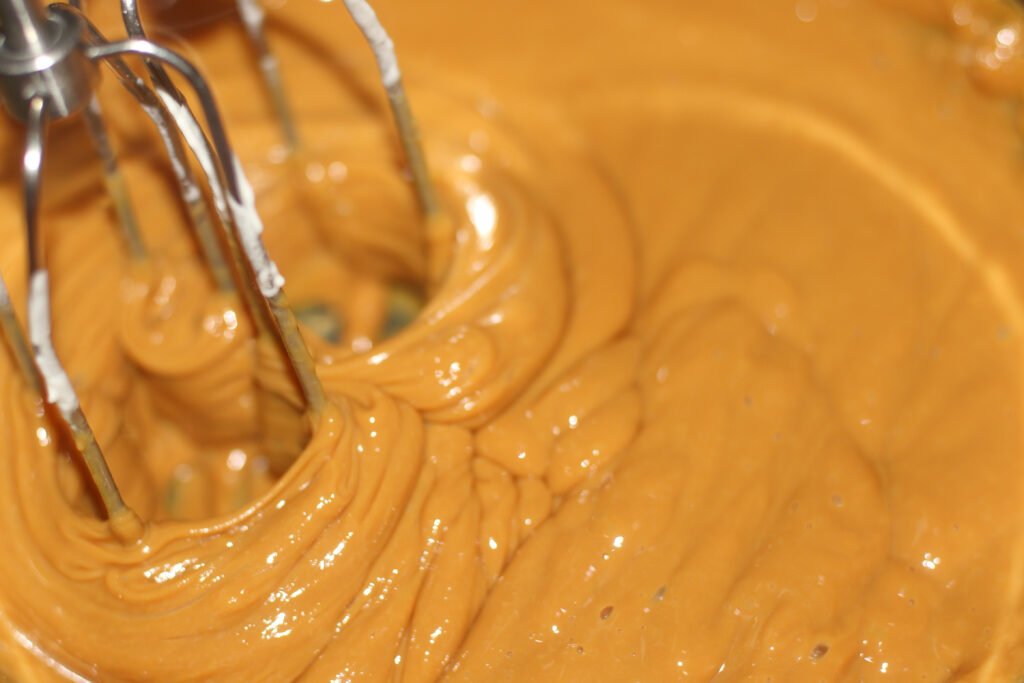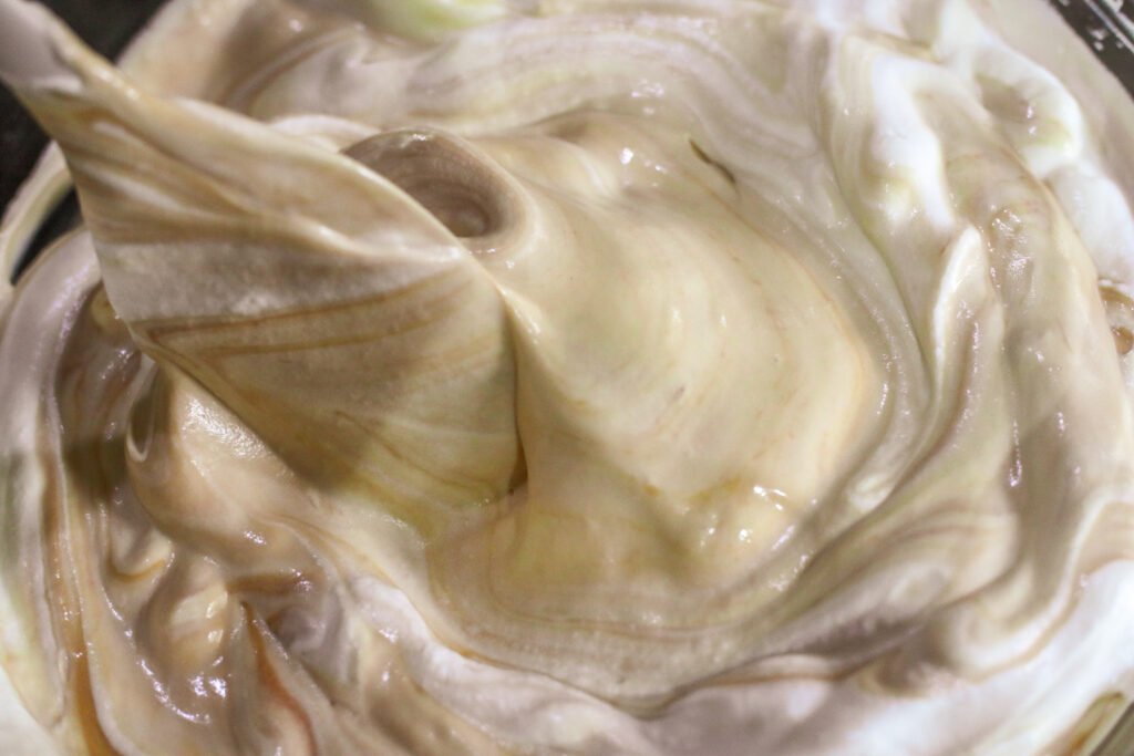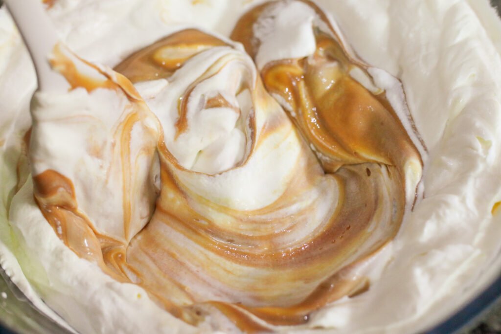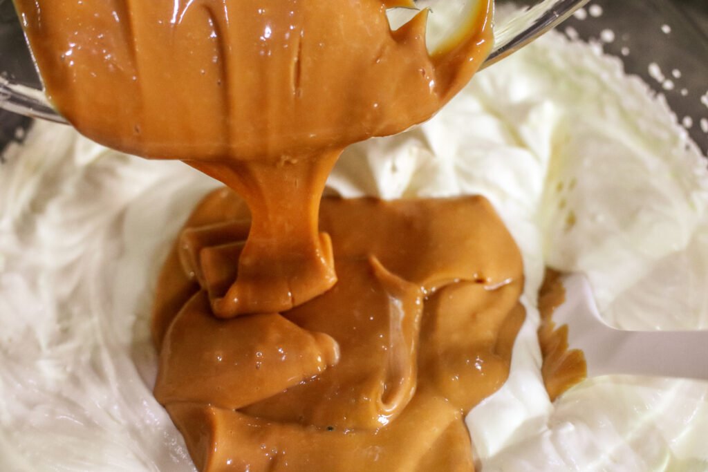 - Gently fold the whipped cream into the caramel until fully combined. Use light movements to keep the mixture airy.