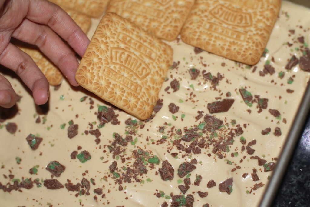 - Start layering:– Arrange a single layer of coconut biscuits in the base of a 9-inch (23 cm) square or rectangular dish.– Spread about 2 cups of the caramel cream mixture evenly over the biscuits.– Sprinkle chopped Peppermint Crisp chocolate over the cream layer.– Repeat the layers of biscuits, caramel cream, and chocolate until the dish is full. Finish with a layer of caramel cream topped with Peppermint Crisp.