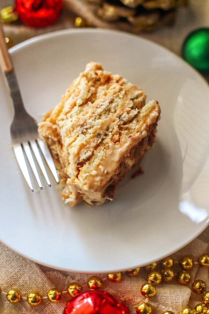 - Finish the last layer (top layer) with caramel cream topped with Peppermint Crisp.