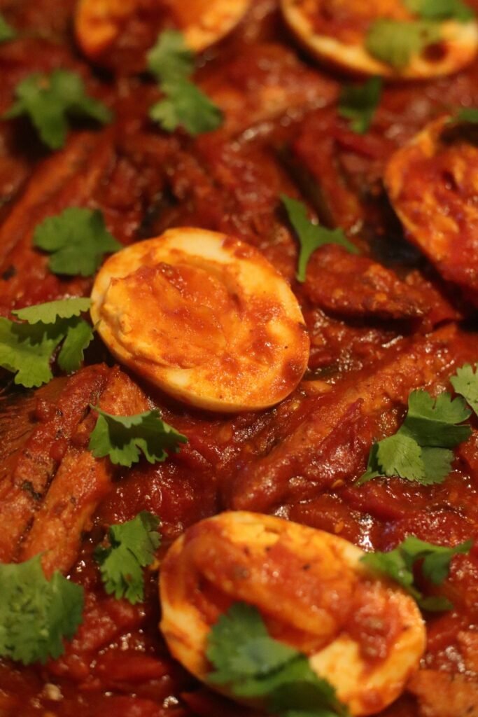 Step 10 (Optional): Arrange sliced boiled eggs around the pilchards and lightly spread chutney over them.