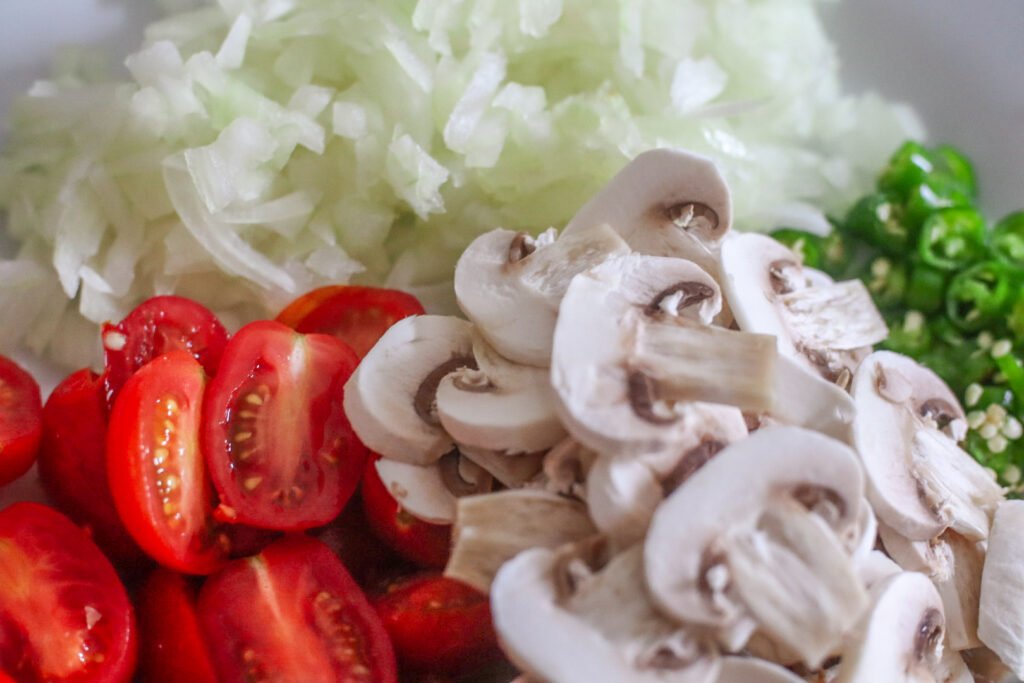 • Start by soaking the baby spinach in a bowl of cold water with 1 teaspoon fine salt. Let it sit to loosen any grit. You will drain the spinach later (before adding it to the eggs). While the spinach soaks, prep the rest of your vegetables. Dice the onion, slice the green chillies into rounds, slice the mushrooms, and cut the cherry tomatoes in half. Set everything aside.