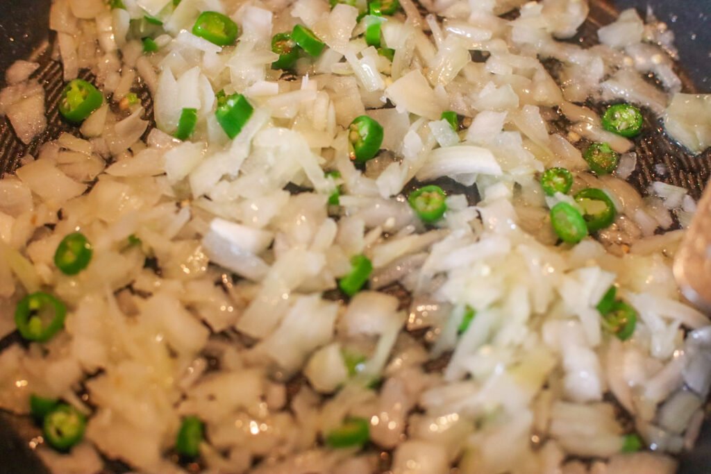 • Add the diced onions and sliced chillies to the pan. Cook, stirring occasionally, until the onions soften and turn translucent.