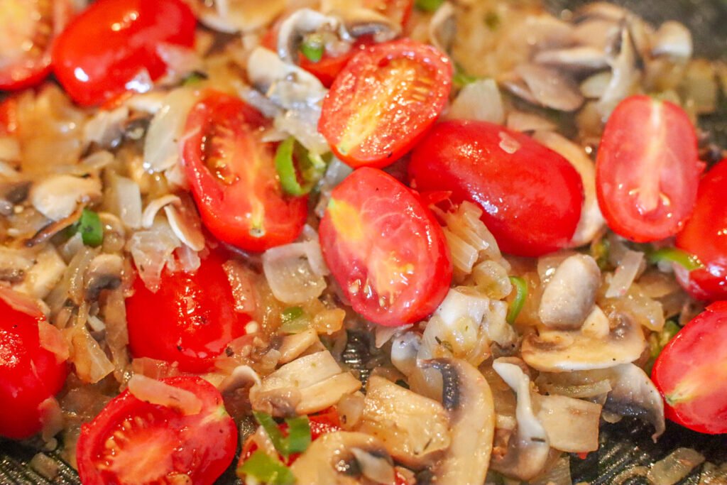 Add the halved cherry tomatoes and cook just until they soften slightly. You want them juicy, not mushy.