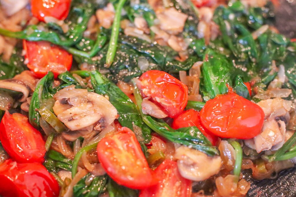 • Add the drained spinach to the pan and cook until just wilted. It should shrink down and blend easily into the vegetables without overcooking.