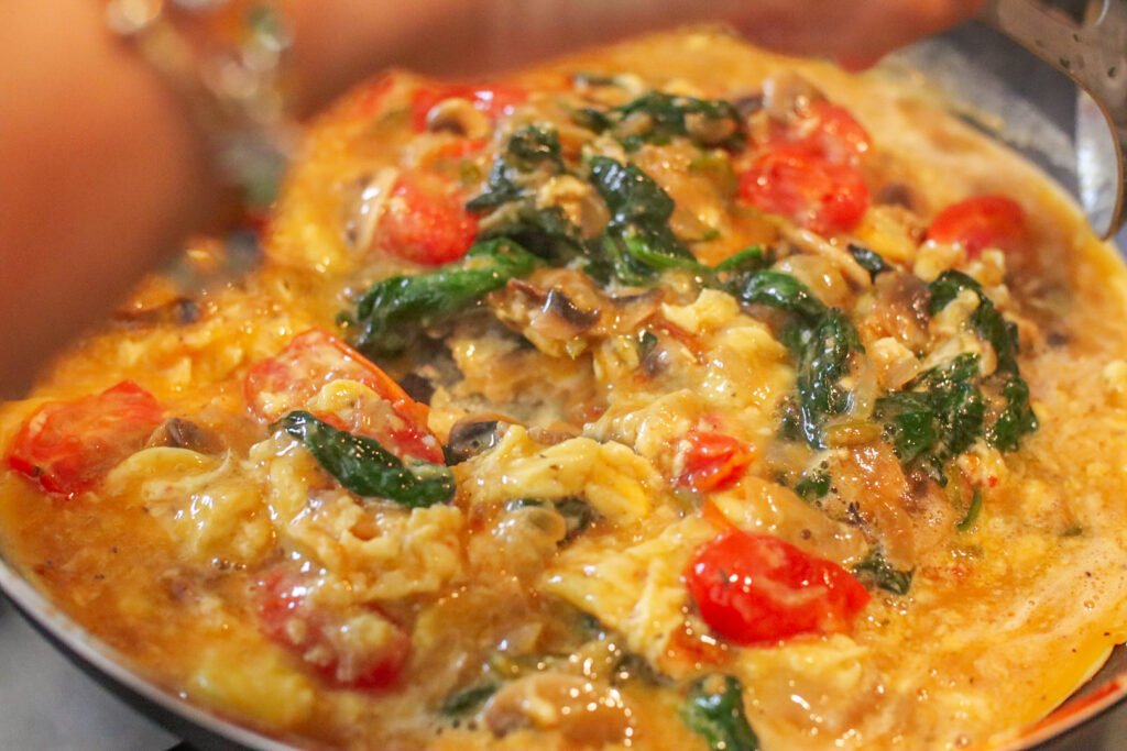 Some mornings call for comfort, not complexity. These veggie scrambled eggs are soft, fluffy, and packed with simple ingredients you probably already have. Onions, mushrooms, fresh green chillies, baby spinach, and juicy cherry tomatoes come together in one pan for an easy breakfast that feels nourishing and satisfying. It’s quick enough for busy mornings, but good enough for a slow weekend brunch.