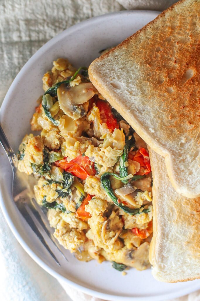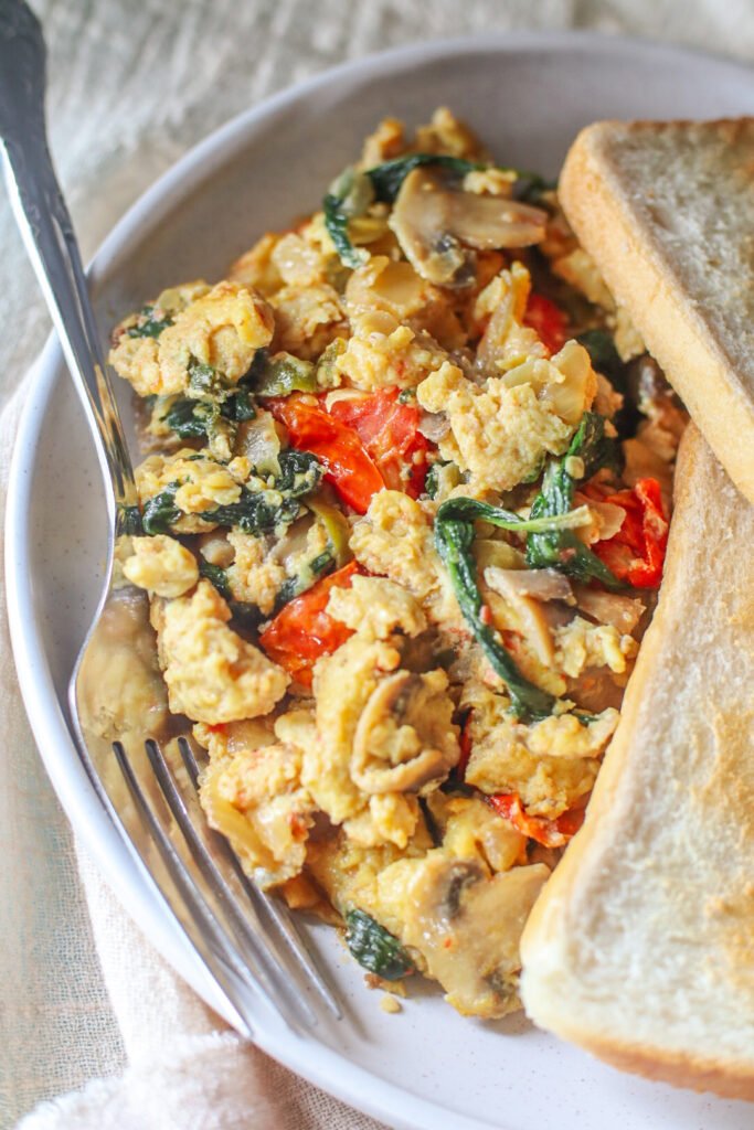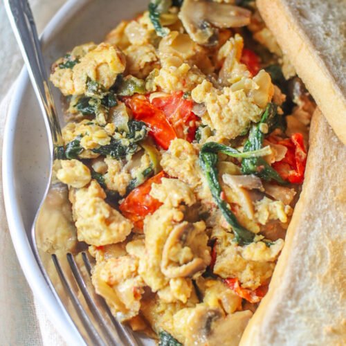 Soft, fluffy veggie scrambled eggs made with onions, fresh green chillies, mushrooms, baby spinach and cherry tomatoes. A comforting, one-pan breakfast that’s easy, nourishing, and perfect any time of day.