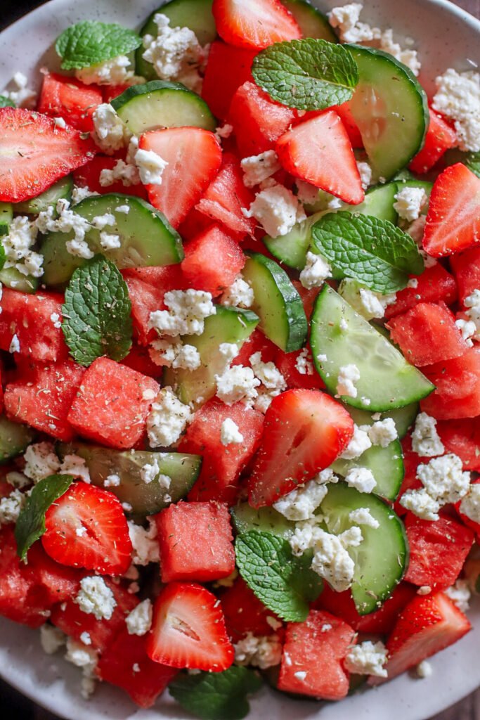 Watermelon Salad With Strawberries, Feta, Mint And Cucumber