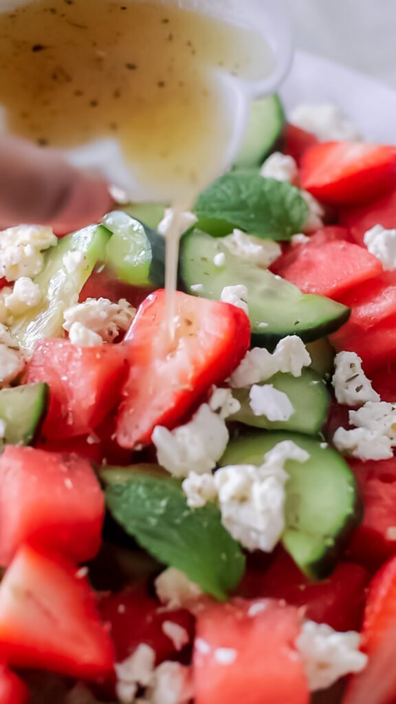 This watermelon and feta salad with strawberries, cucumber, mint and a lemon dressing is everything you want in a warm-weather dish: crisp, juicy, simple, and full of fresh flavour. It comes together in minutes yet looks and tastes like something you’d serve at a summer garden party.